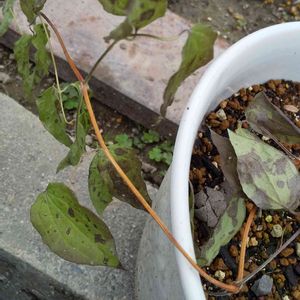つい先日お迎えしたばかりの、雨ざらしのクレマチスさん、葉っぱが黒くなって来ました‼️上の方には少し元気な花芽と葉っぱがあります😅