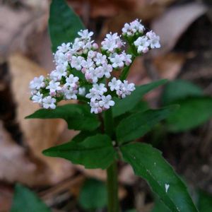 里山徘徊 5/1 角田山 コノ娘はセリ科では、ありませんが、小さい花が、まとまって咲きます。やっぱり地味。 ✌️✌️✌️😃😃😃✌️✌️✌️ ツルカノコソウ(蔓鹿の子草)スイカズラ科カノコソウ属の多年草。『茎葉は対生、短柄があり頭大羽状に裂け、小葉には波状の鋸歯があります』。花の下に付く茎葉に特徴があるので、オイラにも同定できます。長い走出枝を伸ばして増えます。縄張りでは、カノコソウの自生の報告は無いそうで、オイラもならって、すべてツルカノコソウだと思い、走出枝の確認はした事がありません。 ✌️✌️✌️😃😃😃✌️✌️✌️ 地味な白い地味娘達でした。