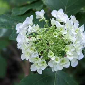 柿の木の根元の柏葉紫陽花の お花が美しく咲いています 額紫陽花と違って柏葉紫陽花は 白い萼片の真中の黄緑の部分が 両性花なんですね 装飾花と両性花が一つに… …ということはこれからもっとお花に見えるものが密に咲いて来ますね 何とも難しい…😮💨