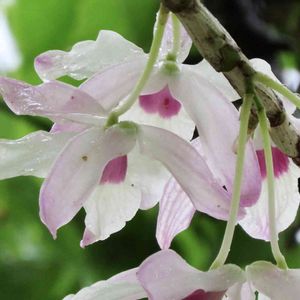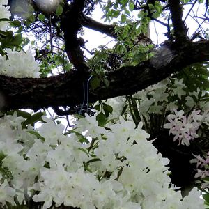 シトシト雨の中、義母宅のデンドロビウム 20年近く前の母の日に私が贈った白いデンドロビウムと、お向かいさんに頂いたピンク色のデンドロビウム 花育ての上手な義母は、 枝垂れ梅やヒトツバの木に着生させて、 今年は特に見事な咲き方です𓂃 𓈒𓏸𑁍𓂃 𓈒𓏸𑁍