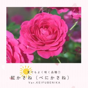 . 夏でもよく咲く品種⑦ - 紅かさね - 「紅かさね」は美しい着物の重ねのように 鮮やかなローズレッドの花びらが 幾重にも重なります。 葉の軸が細く、 たおやかな咲き姿が魅力です。 株はまとまりやすく背丈が低いので 草花との相性が良く、 お庭を華やかに飾ってくれます。 春から秋にかけて繰り返しよく咲き、 病気にも暑さにも強いです。