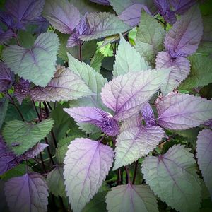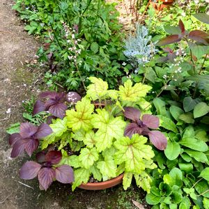 ヒユーケリラの鉢に赤紫蘇が生えてきて、渋い寄せ植えになりました。