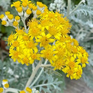 シロタエギク(白妙菊) 白い毛の生えたシルバーリーフが目を引きますね👀 英名ではDusty miller(埃まみれの粉屋)と呼ばれることもあるそうです! 綺麗な黄色の花ですが、開花させると株が弱るので、通常は蕾のうちにカットして葉を楽しむそうです!