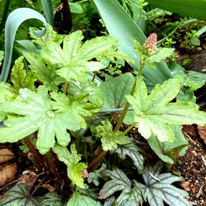 雨上がりの庭で。ヒューケラの花芽が出てきました。