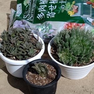 初めて多肉植物の植え替えしました。 こんな 植え替え方で良いのだろうか、と思いながら 右側の子から 一株取り一人立ちさせました。 私流で植え替えた。😅 此で3鉢に増えた。😲大丈夫かしら 🤭💦💦 上の多肉植物用ので植え替えたのですが、 袋に水で固まるって記載してたけど、 意味わからない 😆