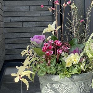 先日お迎えした ❁シックな葉牡丹 クリスタルレッド ❁カルーナ カーデンガールズシリーズ ❁ビオラももか“ぶどう” 切り戻したので、ここにお花はありませんが、モリモリを楽しみにしてます(^^♪ 後、何を寄せようか、、、🤔 お仲間に入ってもらうことにしたのは… ✾スプレー葉牡丹 デュエット シックな色の差し色として💗 ✾スノードラゴン ニチニチソウと寄せ植えしていた鉢から♪ これで動きを足そうと思いまして♫ ひと株を2つに分けて、前と後ろの2ヶ所に♬