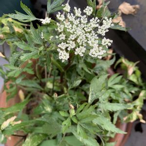 暑さと水不足、葉を何枚か枯らせ 夕方の水撒きを開始3日後に複散形状の白い小さな花を咲かせてくれました。