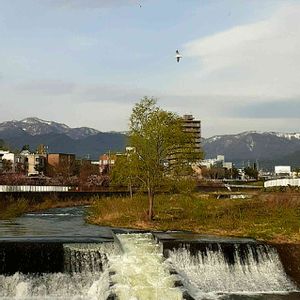 梅も桜ももう終盤ですが、山の頂上の雪はまだ残っています。雪解けの水がゴウゴウと音を立てて流れています。カモメが気持ち良さそうに飛んでいました。