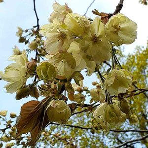 花見サイクリングにて🚴♀️ 淡黄色の鬱金桜(ウコン桜)が咲いていました。咲き初めは白、咲き終わりは中央からピンク色になっていくそうです♡〈西野緑道にて/2022.5.7〉
