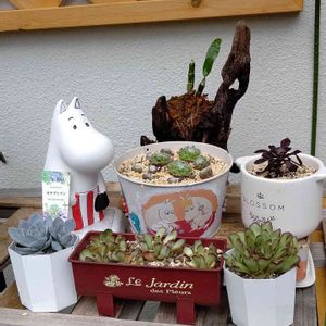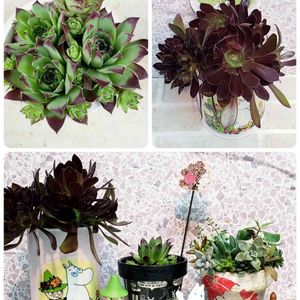 ↖️子沢山のセンペルビウム。✨ ↗️地植えの黒法師の枝が混んでいるところをカットして、リメ缶に入れてみました。🎶 ⬇️向かって右から、さくら餅子さんからいただいたリメ鉢と寄せ植え。 真ん中は、hiichanさんからいただいたリメ鉢に、↖️のセンペルビウムを株分けして植えたもの。 左は、自作のリメ缶に、カットした黒法師を入れた↗️のもの。 🏷️子株の日 🏷️9日は黒法師の日 🏷️ムーミンの日 に参加します。😄🎶 頑張ろう❗日本‼️ 👊✨