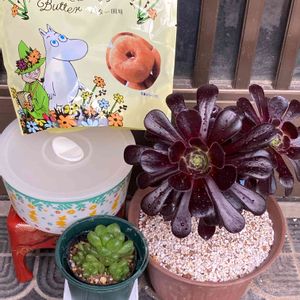 (○´∀`)ノ゙こんにちゎ★ 🏷子株の日 🏷ムーミンの日 🏷9日は黒法師の日 参加します(´,,•ω•,,)ノ 子株がわちゃわちゃしてるメビナさん(笑) ムーミンも圧倒されちゃってる⁉️🤭 黒法師さんちょっと焼けちゃったところあるけど、葉っぱにハリが出てきて元気になってきました🖤 まだまだ小さいダイソー産。