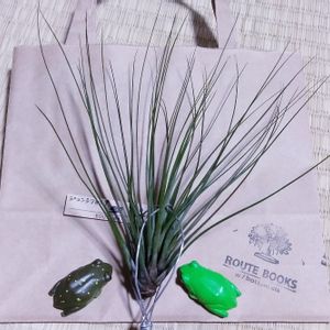 久々のお出かけでお迎えした、チランジア ジュンシフォリア。カエルを添えて。
