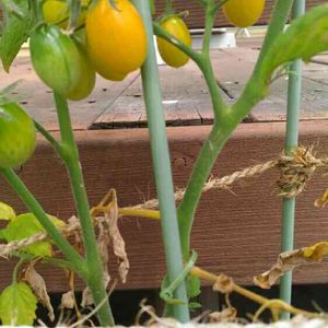 ミニトマト(黄) 水控えすぎて、下の方が枯れてます。 けど、実はなってるからこのままで大丈夫なのでしょうか。 初めて植えたんでよくわかりませーん。