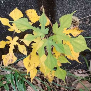 道端に変わったカタチの葉っぱが!? 調べたらヒメコウゾに似た桑の葉でした😅 違いは 切れ込みが左右非対称で大きく丸く切れ込み、葉色も濃いのがコウゾ とありました コウゾは和紙の原料 桑はカイコが食べて繭玉になり、紡いで絹になります 桑の葉にもいろんな形が あることを知りました