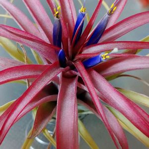 チランジア、咲きました😊 最初に伸びた花はあっという間に萎れてしまいましたが。 紅葉した葉っぱと相まって全体が一つの花のようにも見えますね
