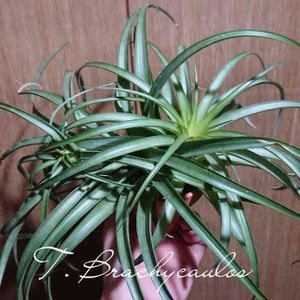 Tillandsia bracycaulos:チランジア ブラキカウロス 緑葉種のチランジア 緑葉種なので水をたくさんあげたほうがよく育つ、 というかタンク系のブロメリアみたいに水をためていてもいい気がする。 緑葉種なのに直射日光に耐える、日に当てると発色がすごく良い。 (チランジアじゃなくてフリーセアなんじゃないのかこいつ・・・) カピタータやポリスタキア、ベルティナと名前が付けられて売られていたりする。 見分け方は銀葉種か緑葉種の違いと、花茎が伸びないで花が咲くかどうか。 葉っぱが薄くてすべすべしている。しなりがあるが折れることもあるので注意。