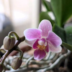 おはようございます。 ミニ胡蝶蘭❣️ 一輪咲きました。 可愛いくてパシャリ〜
