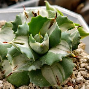 ●キジカクシ科 ●リュウゼツラン(アガベ)属 ●アガベ・王妃雷神錦(白中斑)😸😽 うちにいるアガベの中で、一番調子が悪い子になります…🤔 下葉も枯れ、子株も色合いが悪くなってる…😅ヤバイな…
