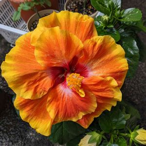 八重のハイビスカスメデューサと斑入りハイビスカスマリーナサンライズ🌺 マリーナサンライズは赤でめしべが長い花が咲くそうです😆 6/18横浜赤レンガ倉庫「はなむすび」で購入しました