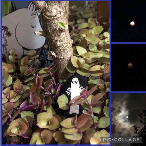 はじめまして…🎶 🏷 ムーミンの日 参加させて下さいね💕 ハイビスカス🌺の鉢でご機嫌な多肉の森に🪴 ニョロニョロもビックリ(~˘▾˘)~ あれ、ムーミンは何してるのかな(・・)💦?🎶 右は昨夜の月(上、中)と今夜の月を一緒に!
