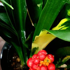 おはようございます☔ 今日のお花 オモト(万年青) 1枚目と2枚目は 斑入りの葉と赤いつやのある実がきれいな 宝船おもとです🌿 3枚目は 葉に縁どりのある 有田のおもとです😀 🏷️真っ赤な火曜日 に参加させて下さい😄