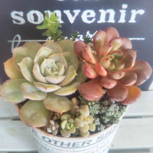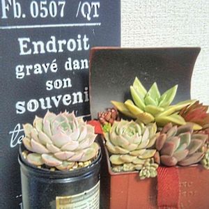 10/15にハロウィン🎃飾りと共に撮影&投稿していたDAISOエケベリアの寄せ植え! 右のピンクルルビーはあっという間に色づきました😃 左の謎エケベリアはオウンスローかなぁ?と思いながら狩ってきたのですが、わが家のオウンスローとはちょっと違う色になってきました。この子、誰かな〜? 作りたての時は全体に緑白っぽくってかわいかった💕んですが、その時と違う雰囲気になり、カラフルでこれまたかわいいです💕
