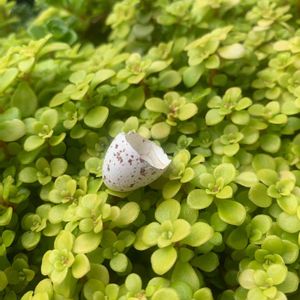 🍀マルバマンネングサに燕の卵🥚🍀 朝のタニパトしていたら燕の卵が👀 毎年、最初の雛が孵ると殻を一つちゃんと落として教えてくれます。2個目からは蛇🐍の襲撃を怖れてか、遠くに捨てにいくみたいです❗️賢いなーと。 雛の💩が落ちるから鉢は避難させなきゃね!可愛い声がさじきに聞こえてくる事でしょう🐣🐣🐣