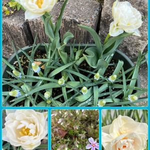 🪴今朝の庭🪴 八重のチューリップとムスカリの球根セットより🌷 チューリップ🌷5球入ってたはずなんだけど…🧐 なかなか揃ってイメージ通りにはならない⁈ ブルーのムスカリが色付く頃にはチューリップが終わってしまいそう😅 頑張れ!!チューリップ🌷 🌟左下 そのチューリップ🌷 🌟真ん中下 芝桜🌸咲き始め 🌟右下 八重の水仙