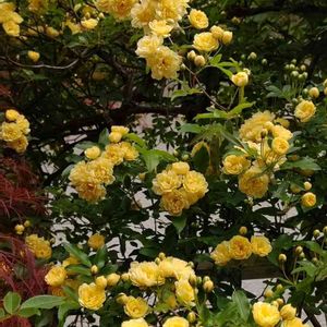 木香薔薇(モッコウバラ)が、咲き始めてました❣️ フェンスに絡ませて黄色いフェンスにしようと企んだけど蔓性が弱いので誘引してあげないといけません! 背景には、赤い葉のノムラモミジがあり、 黄色と赤のツートンカラーのコラボです❣️