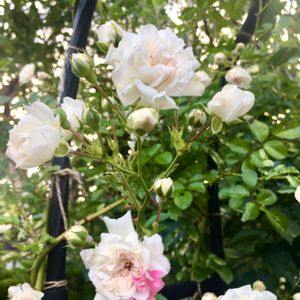 こちら、実家の亡き母が昔から育てていたつるバラです。 白いミニバラで、 時々ピンク色が見えて、とっても可愛い💕 放置していても毎年咲いてくれる強い子ですが、 なんという名前の薔薇なんでしょう? ほのかに良い香りもして 癒される薔薇です💖
