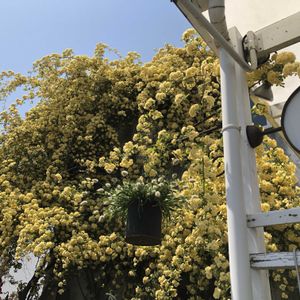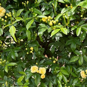 嬉しい〰️(⁎˃ᴗ˂⁎)♡⤴︎⤴︎ やっと蕾をつけてくれた♡ 擁壁に這わして7年目🤩 黄モッコウバラ ガジュマルの上からコンニチハ| ‹:)~❁ メジャーリーグチケット🎫 当たりそうな予感😙