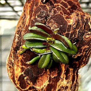 500円玉くらいの大きさのランです。上から3段目の葉の下にツボミを見つけました😊その下には昨年シケた花茎が💦 Schoenorchis fragrans ショエノルキス フラグランス (着生ラン)
