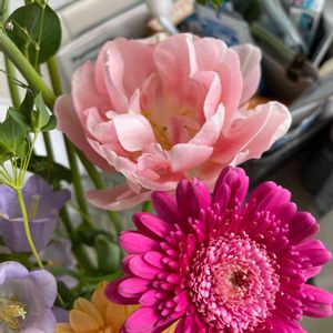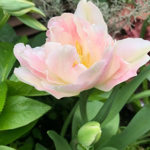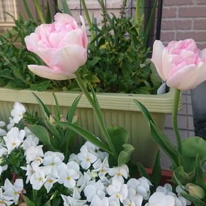 八重咲きチューリップ🌷 アンジェリケ💗 薄ピンクの可愛い子💕 これが🌷最後かなぁ…\( ˘ω˘ )/" お花がどんどん移り変わっていくよ〜🌸🌷🌹🌼🌿 毎日見てても飽きないくらいに╰(*´︶`*)╯♡