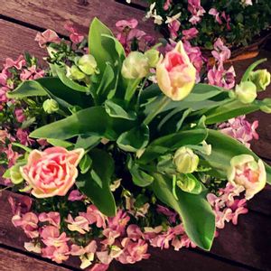 ♡チューリップ・アンジェリケ🌷𓂃܀❀ 寄せ植え (4/11撮影) 昨年秋に初めてお迎えした八重咲きチューリップです~🌷 花びらの中心は紅をさしたように可愛いピンクなんですね~😊🌸 フラワースタンド上のバコパとヒュケラさん寄り添うように咲いてくれました。どのお花も可愛いくて癒されます~♬💕 今日も元気に過ごしましょう~😊☘️