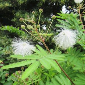 ネムノキ😪💤💤 お花が美しいお寺の境内で、シロバナのネムノキを初めて見ました😲 昨年植えられたそうです☺️ 近くのお店でモグモグTime🍽️ 店内のガラス窓からなにやら赤い影~こちらにも葉陰にネムノキ😊♥️