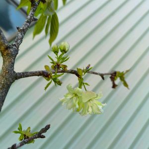 うす緑で咲く"右近の桜" 随分前に苗木を頂き、右近の桜 と教わった気がするのですが、自信がありません(・´ω`・) 暮れに思い切り伐採しても思いの外、花をつけてくれました🌸 葉が出るのと同時に咲くので、意外と気がつかないんです(´*ω*`) 先に咲いた花は、花の芯が段々と淡い桃色になってきています🌸