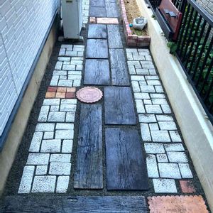 こんばんは〜 本日の成果です。 花壇の枠を立てて、枕木擬木とタイルを敷きました。 5時間くらい作業してましたかね… めちゃめちゃ疲れました😅😅 この手の作業は、水平を取って整地するところが一番大変なんですよね… そこをちゃんとやらないと、水が溜まったりするので、石を配置しながら何度も微調整しました💦 今日はとりあえず前半分… 残りの玄関までの部分はまた後日やります。 花壇も枠を作っただけなので、後日、土を入れていきます。 汗ダラダラでした〜 今日はビール🍺飲むぞ! この場所の前の様子は 🏷はなずきんアプローチ で見られます。