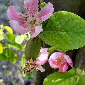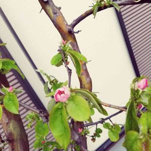 カリン(花梨) まあるい蕾がパカっと割れた カリンの実がなったらハチミツ漬けにしたいけど、なかなか実になってくれません😞