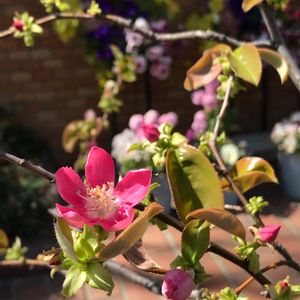 昨日のお庭🌳🌸 左上:シデコブシの花びらが大きく開いて、数日前の投稿とは違うお花のように見えます。 右上:カリン開花🌸お花が小さく、濃いピンクで可愛い🥰 下:椿もピークかな。