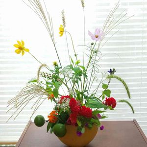 混ぜさし 初秋の植物を 詰め込んで いけました ススキ えのころ草 ようしゃヤマゴボウ ケイトウ二種 マリーゴールド コスモス二種 実もの(レモン)