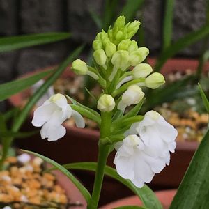 ウチョウランです。 自然大好き派😘、兼園芸もやっています派です。我が家のウチョウランシリーズも終わりが近づいてきました。花は美しいのですが名前は??です。名札📛を無くしたのでは無く、最初からありません😂。もし、名前があっても数本寄植えしているので2年目には名前が分からなくなるでしょう。親株から少し離れた場所に根塊(球根)を作るのでどの親の根塊か不明なんです😅。 まあ、名前が無くても楽しんでいます。