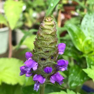 ウツボグサです。 自然大好き派😘、兼園芸もやります派です😅。山野草の寄植え鉢(と言うよりは単にその辺りの草を一つの鉢に入れただけ。5.26に最初のホタルブクロをアップ)でこの花が開花して来ました♪😊。花は下から順に上に向かって開花して行きます。横から見る👀と円錐形ですねー😊。撮影は昨日(6.16)です。