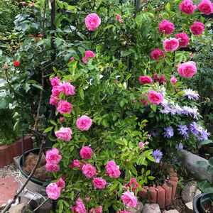 今朝の庭 鉢植えの薔薇がピークを過ぎ、庭の薔薇、クレマチスが咲きそろって来ました☺️ 見てくださってありがとうございます🌹 (❀ᴗ͈ˬᴗ͈)⁾⁾ペコリ