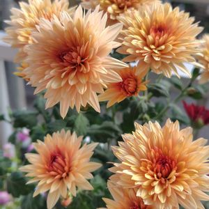 こんばんは🌃 昨日今日と雲が多く、スッキリとした晴れ間☀が欲しいです〜😊 ①②半八重咲きマム ダンテ 3色混色の鉢植えですが♥️🧡だけ咲いて来ました〜ピンク🩷はどこ行ったのかな😅 🧡はアプリコットカラーでとっても可愛いカラーです ③パンジー ローヴドゥアントワネット ロココ♥️ お迎え出来たんですよ〜😉 大人っぽい色合いですね…もっとグリングリンになって欲しいなぁ😁 ④種蒔きした葉牡丹の苗が順調に育っていますが…ビオラと寄せ植えにはまだ難しいです💦 ⑤今日出先でモミジバフウが綺麗に紅葉🍁してるのを見ました! モミジより先に紅葉しますね〜グラデーションが綺麗でした