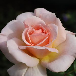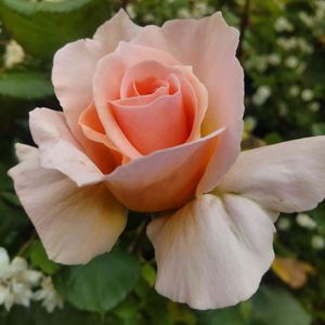 鉢植えのバラ ヨハンシュトラウスが咲いています。アプリコット味を帯びた淡いピンク色のバラです。