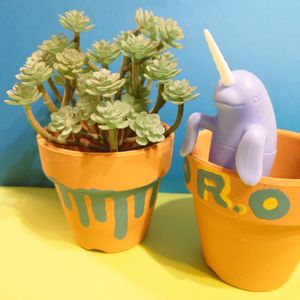 鉢の準備💨💨 撮影協力は人工多肉さんとイッカクに🙂💡 ミルクペイントで鉢にお絵描き🎵 なーんか思ってたのと違うけど、ま、いっか😅