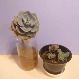 はるか去年の夏に花屋の片隅でボロボロ100円でお迎えした名前のわからない多肉さん🌱✨ 数ヶ月経ち、頭部分は水耕で復活し、下の方にあった取れたもしくは取った葉っぱ3枚は葉挿しっ子として復活しました👏🎶 これらを100円では買えないので、なんか多肉ってスゴイ🤓🎵