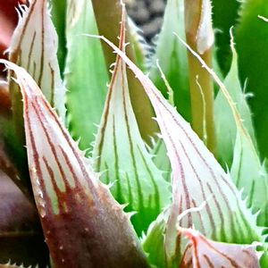 Haworthia davidii 中心に近い葉の下方グリーンから上方ブラウンに向かっての色彩変化が綺麗。 影を濃く画像処理しています。 昨日はベランダ組の生存状況を確認しました。 レイトニー系2鉢、オブト系2鉢と1株、トゥルギダ親株1鉢、黒法師1鉢、キウイ1鉢、レツーサ2株、十二の巻3株、クローバー1鉢が完全にアウト。 私が岡山に来てここまで寒い事は1度も無かったです。 今回の寒波のお陰かハオルチアの最低耐久温度は大まかに把握出来ました。 水切りしていればオブト系は-2℃迄、レース系は-4℃迄が無難ですね。 それ以下も耐えますが、日数が続くと危険です。