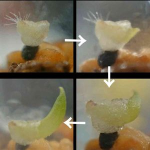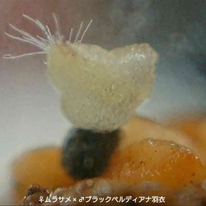 お久しぶりです😃 3月8日に採取し、9日に試験管に蒔いた種が🌱芽吹いたっぽい。 とても芽に見えない・・・ 本当に芽でしょうか? ♀ムラサメ、♂ブラックベルディアナ羽衣です。 2粒蒔いてあります。 3月6日に3粒蒔いた♀ブラックベルディアナ羽衣、♂ムラサメの種も1つ🌱芽吹いたっぽい。 一応、銀イオン水で殺菌しているのでカビではないと思います。