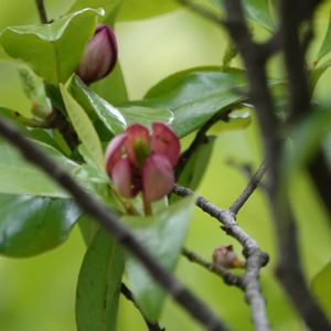 オガタマノキ 我が団地の植栽の中に見つけました。カラタネオガタマより花はずっと小さく3cm位でしょうか、カラタネオガタマより赤味が強いです。 シキミの隣に植えてありました。シキミは仏事の魔除けとして、オガタマノキは神道思想の招霊(おぎたま)から訛りオガタマになったようです。常陸宮正仁親王のお印。漢字表記は他にも多々あるようです(Wikipediaより抜粋引用) Googleレンズで名前を検索しました。